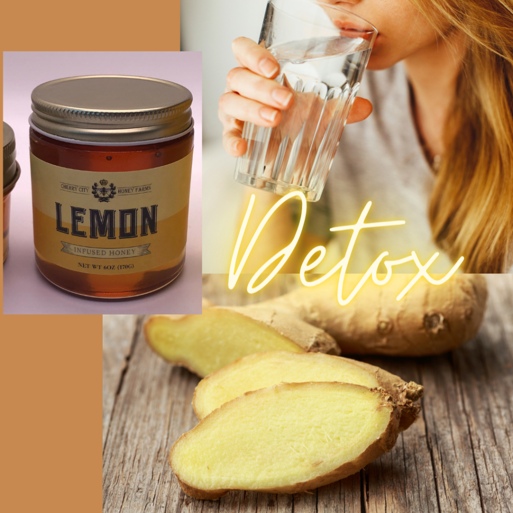 Having a jar of sliced ginger and lemon infused honey to add to water makes it easy to enjoy detox water throughout the day.  The kitchen harvest says, “Adding lemon ginger water to your daily wellness plan will help alkalize and cleanse your body, give a boost to your immune system and help you lose weight.  Drinking warm ginger lemon water is also a soothing drink to sip on when you’re feeling under the weather during cold and flu season.”