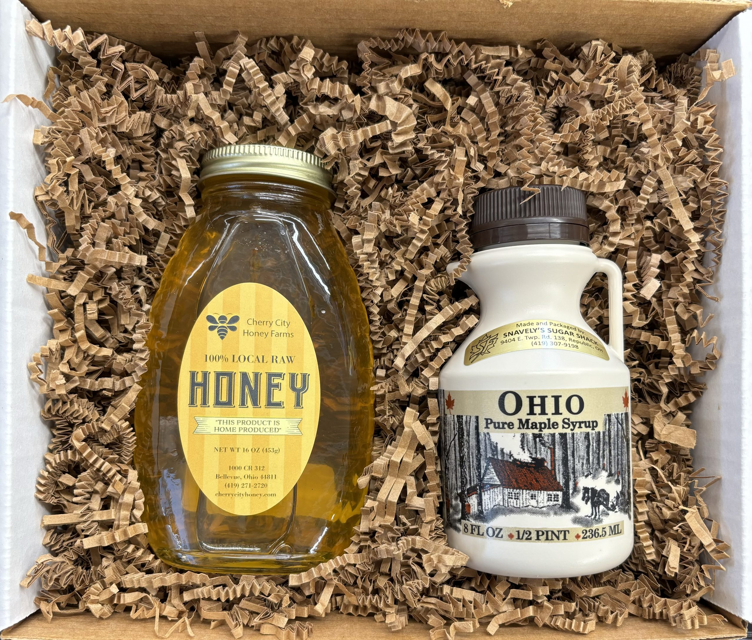 The Local Gourmet Gift Box brings together two local, handcrafted favorites in a beautifully packaged gift perfect for any occasion. Each box features a 16-ounce jar of our rich, raw honey and a 1/2 pint of 100% pure, locally sourced maple syrup, both crafted with care by small producers who take pride in delivering the finest natural flavors North Central Ohio has to offer.